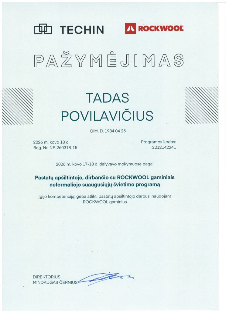 Naudojame tik aukštos kokybės, sertifikuotas statybines medžiagas. Karkasams – džiovintą, kalibruotą medieną, šiltinimui – mineralinės vatos arba ekologiškas izoliacines medžiagas. Visas medžiagas parenkame atsižvelgdami į Lietuvos klimato sąlygas.